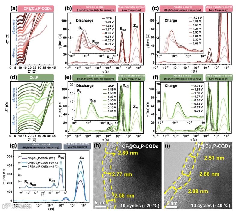 图5:a) CF@Cu3P-CQDs和d) Cu3P在初始充放电(0.1C)过程中的阻抗谱(Nyquist图)。从不同电压下的阻抗谱测量计算得到的b,c) CF@Cu3P-CQDs和e,f) Cu3P的DRT曲线。g) CF@Cu3P-CQDs在25℃、-20℃和-40℃(半放电状态)下的DRT曲线。h) CF@Cu3P-CQDs在-20℃下经过10个循环后的TEM图像。i) CF@Cu3P-CQDs在-40℃下经过10个循环后的TEM图像。
