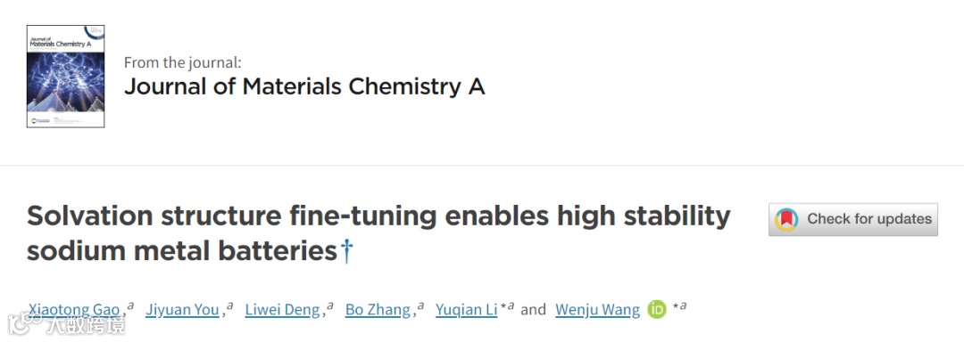 近日,来自南京理工大学的王文举教授和李玉倩讲师合作,在国际知名期刊Journal of Materials Chemistry A上发表题为“Solvation structure fine-tuning enables high stability sodium metal batteries”的研究文章。该研究文章提出甲磺酸-2-丙炔-1-醇(PMS)被作为理想阳极优先成膜添加剂以稳定Na||Na3V2(PO4)3(NVP)电池。分子动力学模拟表明,PMS添加剂可以主动诱导氟代碳酸乙烯酯(FEC)的溶剂化行为,有效抑制溶剂分子的进一步分解。此外,原位光学实验、扫描电子显微镜和X射线光电子能谱表明,PMS和FEC协同构建富含无机成分(NaF和Na2S)的SEI膜,显着抑制钠枝晶的生长。因此,在添加3 vol% PMS电解质中的Na||NVP全电池在2C下1000次循环后表现出99.9%的超高平均库仑效率和92%的容量保持率。本工作为实现高安全稳定的SMBs提供了乐观的前景。