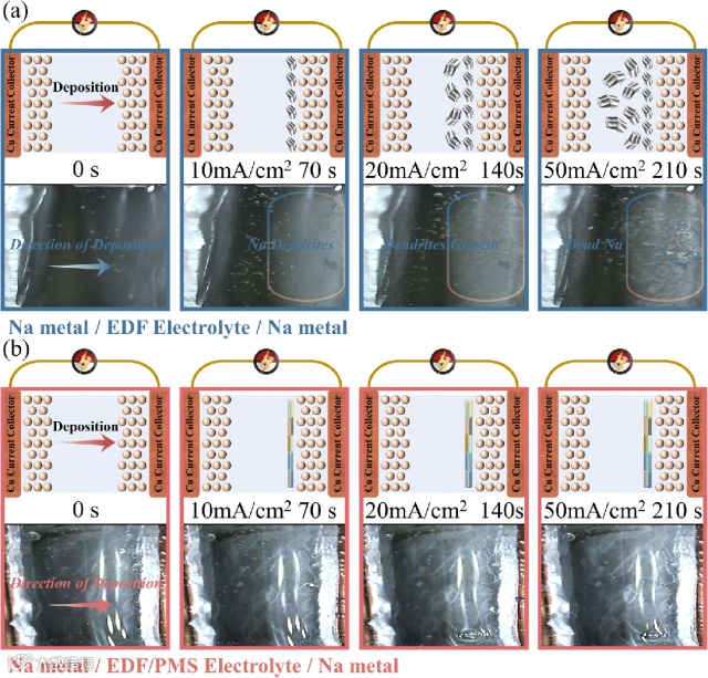 图3. Na||Na电池电沉积过程中电极-电解液界面的原位光学显微镜。(a)EDF中电化学沉积的示意图和光学显微照片。(b)EDF/PMS中电化学沉积的示意图和光学显微照片。