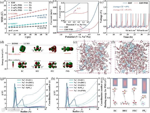 图2.(a)不同添加剂浓度下电解质的均方位移。(b)扫描速率为0.5 mV s−1时不同电解质中的LSV。(c)在0.4 mA cm−2和0.8 mA h cm−2下的Na-Cu半电池。(d)EC、DEC、FEC和PMS的前线分子轨道能量。(e)EDF和(f)EDF/PMS电解质的MD模拟快照。来自MD模拟的(g)EDF和(h)EDF/PMS混合溶剂中的RDF曲线。(i)PMS与溶剂分子和阴离子的吸附能。