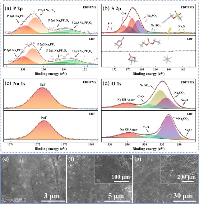 图5. EDF和EDF/PMS的(a)P 2p、(B)S 2p、(c)Na 1s和(d)O 1s峰。(e-g)在具有PMS的全电池中1000次循环后的SEI膜的SEM图像。