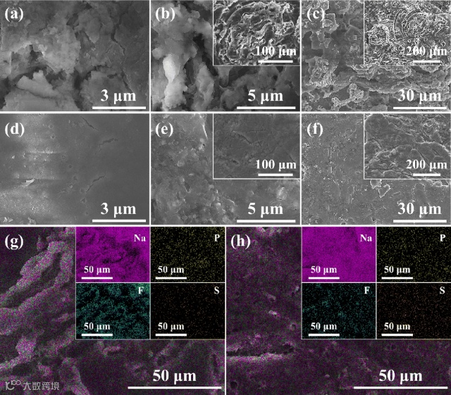 图4. Na||NVP全电池中不同循环后Na阳极的SEM图像:(a-c)EDF-80r,(d-f)EDF/PMS-80r。相应的(g)EDF-80r和(h)EDF/PMS-80r中SEI膜的元素分布。