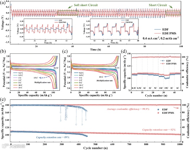 为了验证PMS添加剂对Na||NVP全电池循环稳定性的影响,研究者在2.6V至3.8V的电压范围内进行了长期充放电测试。结果显示,使用EDF电解质的全电池在第300次循环时库仑效率急剧下降,比容量在第450次循环时衰减至89%,这是由于钠枝晶的快速生长导致“死钠”形成,造成不可逆容量损失和库仑效率下降。相比之下,使用EDF/PMS电解质的全电池在1000次循环后仍保持92%的高容量保持率和99.9%的平均库仑效率。这归因于PMS形成了稳定的SEI膜,显著改善了循环稳定性。测试结果表明,PMS能有效提高Na||NVP全电池的倍率性能和循环稳定性,具有良好的应用前景。