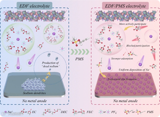 为了验证PMS作为理想优先成膜添加剂的合理性,研究者通过GaussView 5.0使用DFT计算了溶剂分子的前线分子轨道能量。结果显示,PMS具有最低的LUMO能量(−0.37 eV),根据前沿分子轨道理论,PMS添加剂有望优先在钠金属阳极表面反应形成SEI膜。MD模拟进一步分析了添加PMS后电解质溶剂化结构的变化。尽管PMS不直接参与Na+的溶剂化壳层结构,但它诱导更多的FEC参与,并阻碍DEC参与,从而有助于形成稳定的SEI膜。这表明PMS添加剂在提升SEI膜与阳极界面的稳定性方面具有重要作用。