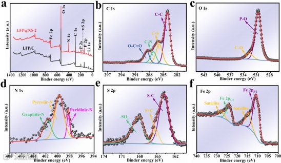 通过XPS测试发现在LFP@NS-2样品中存在N和S的特征峰,这表明硫脲分解产生的N和S已经掺杂到碳层之中。最终结果表明,N,S共掺杂碳层可以改变碳材料的结构,引入额外的电子或空穴,从而提高电子输运能力,提高电导率,改善磷酸铁锂低温性能。