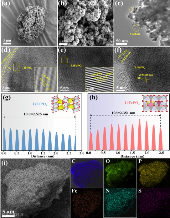 磷酸铁锂的微观形貌和相应的晶体结构特征能够通过扫描电子显微镜(SEM)和透射电子显微镜(TEM)进行表征分析。改性后的LFP@NS-2样品的SEM图谱展现了微观细小的三维多孔结构,且材料形貌均匀分布,能够促进电解质的渗透和离子的扩散,从而产生快速的电化学反应动力学。通过TEM能够发现 LFP@NS-2材料具有清晰明显的晶格条纹。同时,包覆在LFP@NS-2样品表面的碳层厚度经测量在2 nm左右,碳涂层的存在不但可以有效抑制高温烧结时磷酸铁锂晶粒的生长,还能够改善材料的导电性,进而提升磷酸铁锂电化学性能。EDS结果证明了N,S元素均匀分布在磷酸铁锂材料中,表明N,S元素共掺杂到导电碳层中有利于提高LiFePO4的低温电导率,提高LiFePO4电池的电化学性能。