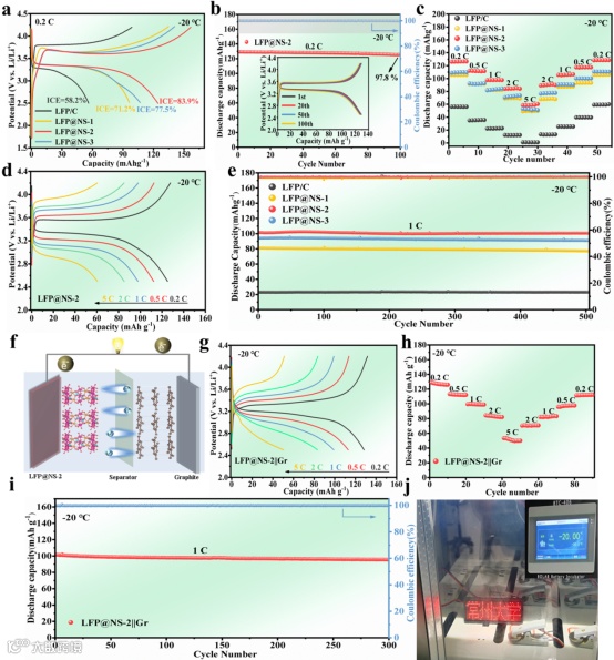 改性的LFP@NS-2材料组装的电池在-20 ℃的低温下展现了优异的电化学性能。在0.2 C电流密度下,LFP@NS-2样品展现出了最佳的库伦效率为83.9%,经过100次循环后,LFP@NS-2样品在0.2 C下呈现出了128.3 mAh g-1的放电比容量和97.8%的容量保持率。在0.2-5 C不同电流密度下的的放电比容量分别为:128.6,113.2,100.3,91.1和64.2 mAh g-1。为了进一步验证改性的LFP@NS-2材料的实际应用价值,组装了全电池并在低温下进行测试,改性的LFP@NS-2样品在0.2 C(-20 ℃)能够释放出120.1 mAh g-1的放电比容量和98.49%的容量保持率。而经过改性后LiFePO4材料克服了低温下离子电导率低和扩散速率小的缺陷,显著地提升了LiFePO4在低温下的电化学性能。证明了N、S共掺杂碳涂层的形成结合三维孔洞结构的设计改善了LiFePO4材料在低温下的导电性和离子扩散动力学,从而有利于提升磷酸铁锂电池的放电比容量和倍率性能。