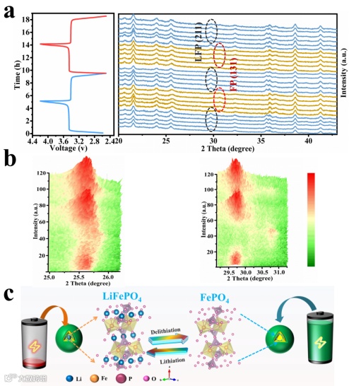 通过原位XRD分析,材料在经历两次充放电后在2Theta为29.7附近即(211)晶面处存在着峰的偏移。其相变机理是充电时锂离子从LiFePO4的晶格中脱出,经过电解液和隔膜嵌入负极,材料由LiFePO4相转变成FePO4相;放电时锂离子从负极重新嵌入FePO4的晶格中,材料由FePO4相转变成LiFePO4相。通过原位XRD分析,通过N,S共掺杂碳涂层改性的磷酸铁锂在充放电过程中发生相变后仍然能够维持晶体结构的稳定性。