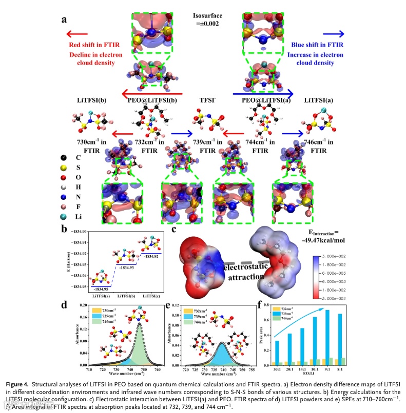 量子化学计算可以用于协助红外光谱分析,并确定LiTFSI在PEO基固态电解质中的赋存状态。通过对不同赋存状态的S-N-S键的电子云密度进行等差分析,确定了红外光谱中各峰所对应的分子构型。后通过对红外光谱进行分峰处理后得到,随着LiTFSI浓度的增加体系中的Li+浓度先增加后降低,EO: Li=9: 1时达到最大。