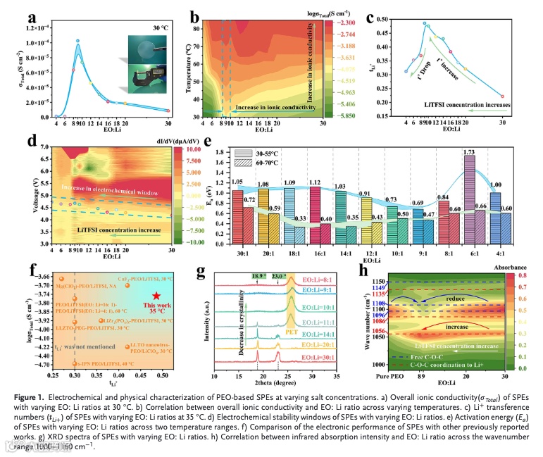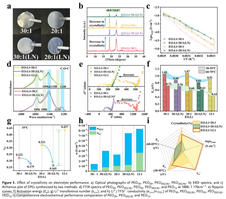 聚氧化乙烯(PEO)基固态电解质是最早被发现并已有小规模产业化的固态电解质,其具有成本低廉、制备简单、可折叠和与电极界面具有良好的界面接触性等优点。但是低电导率、离子迁移数和较高的运行温度(50 ℃)阻碍了其进一步发展。vehicular机制是PEO基固态电解质主要的传输锂离子(Li+)的方式,可分为两步,首先Li+会与醚氧(EO)配位,并随着EO的链段运动到达下一个配位点附近,之后Li+会从原配位点解络合并在新的配位点重新络合;这样的步骤循环往复便可以实现Li+的长程迁移。大量的工作对第一步进行了研究,即降低结晶度以增强EO的链段运动。可是结晶度和运行温度之间似乎并不总是强关联的。所以,本文就结晶度和离子配位与PEO基固态电解质的电化学性能之间的关系进行了深入的研究。
