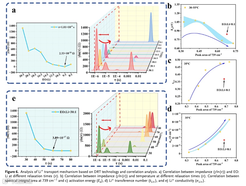 Li+浓度增加可以有效的降低EO和Li之间的强配位,降低Li+解络合的活化能并提高Li+电导率和Li+迁移数。通过DRT分析也可以看出对应Li+解络合的高频阻抗随着Li+浓度的增加而降低。将Li+浓度与Li+电导率、Li+迁移数和活化能相对应,可以看出相关性很强,即增加Li+浓度可以有效降低配位,提高电化学性能。