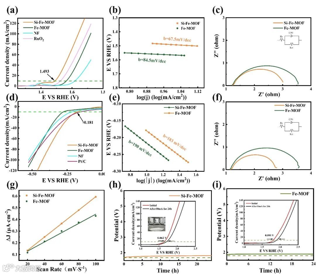 Fig. 3 IR校正后的LSV曲线:催化剂的(a)OER性能和RuO2;(b)相应的Tafel图;1.0 M氢氧化钾中500 mV过电位的(c)奈奎斯特图(插入:等效电路图);(d)催化剂和Pt/C的HER性能;(e)相应的Tafel图;(f)1.0M氢氧化钾中500 mV过电位的奈奎斯特图(插入:等效电路图);(g)催化剂的ECSA图;(h)Si-Fe-MOF(插入:测试设置)和(i) Fe-MOF的长期稳定性试验