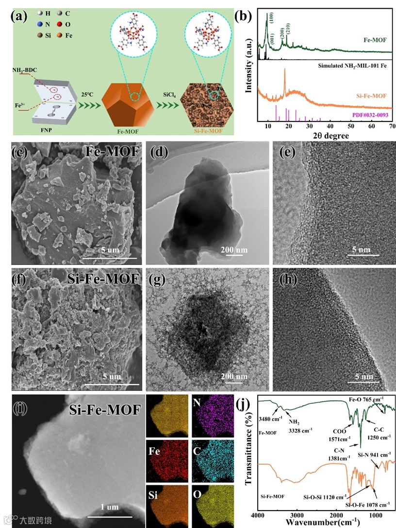 Fig. 1(a)化学方法SiCl4剥离Fe-MOF块体的过程示意图;(b)XRD的总谱;(c)Fe-MOF催化剂的扫描电子显微镜(SEM);(d)Fe-MOF催化剂的透射电子显微镜(TEM)图像;(e)Fe-MOF催化剂的高分辨透射电子显微镜(HRTEM)图像;(f)Si-Fe-MOF催化剂的SEM;(g)Si-Fe-MOF催化剂的TEM图像;(h)Si-Fe-MOF催化剂的高HRTEM图像;(i)Si-Fe-MOF催化剂的能量色散X射线分析(EDX)(j)FT-IR的总谱