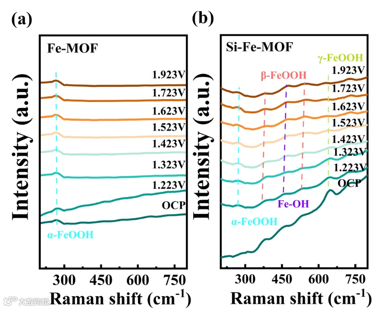 3. 结合原位拉曼表征,Si-Fe-MOF的Fe物种在OER过程中产生活性更高的FeOOH,活性位点充分的暴露。