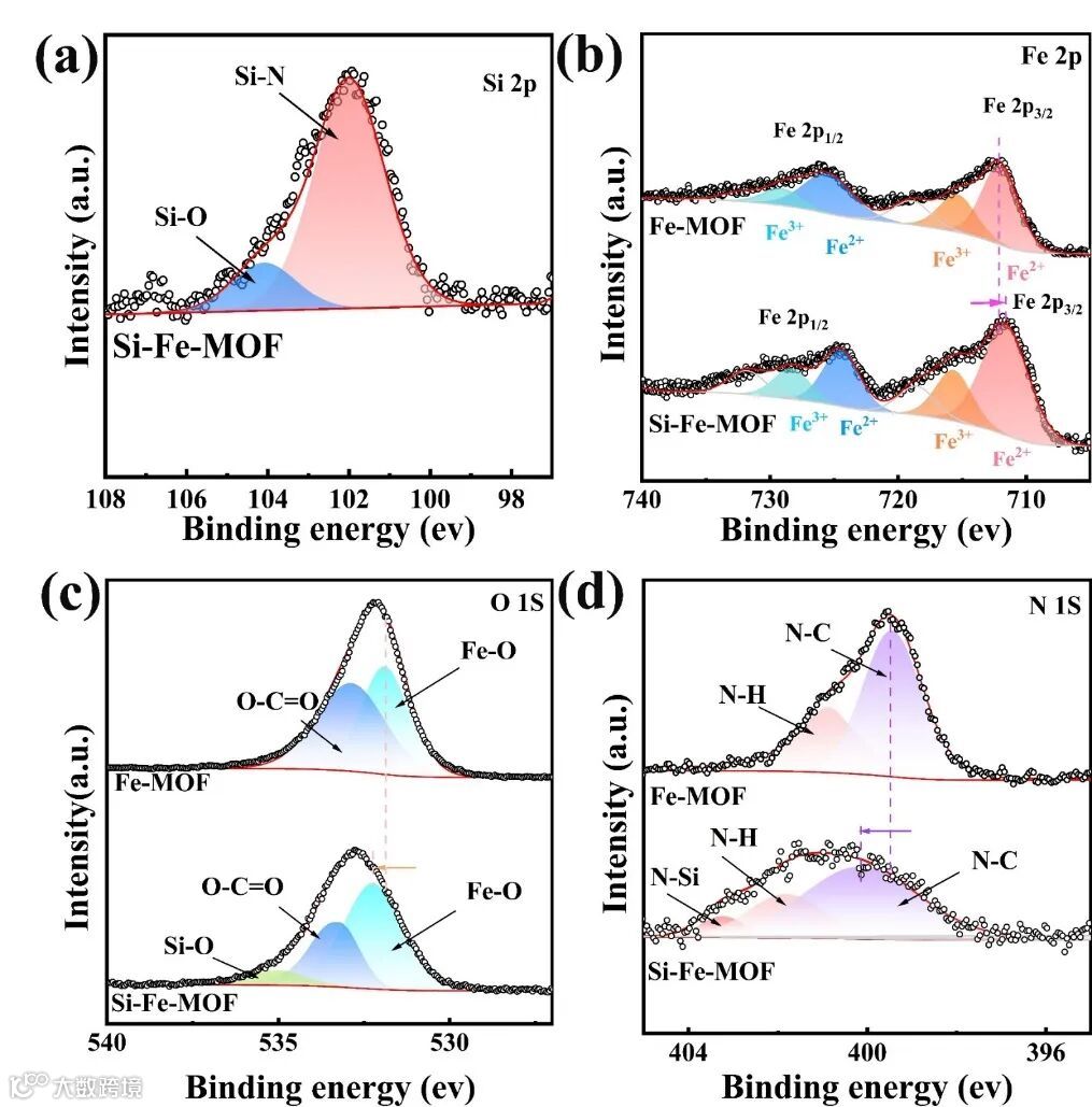Fig. 2(a)Si 2p的总谱;(b)Fe 2p的总谱;(c)O 1s的总(d)N 1s的总谱