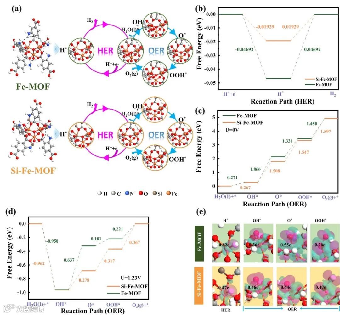 Fig. 5(a)Fe-MOF和Si-Fe-MOF的初始结构和H*、OH*、O*和OOH*吸附后的结构的视图;(b)Fe-MOF(绿色)和Si-Fe-MOF(橘色)在0V偏压下HER的吉布斯自由能图;(c)OER和(d)1.23V偏压下OER的自由能图;(f)两个催化剂模型的电荷密度和Bader电荷转移图
