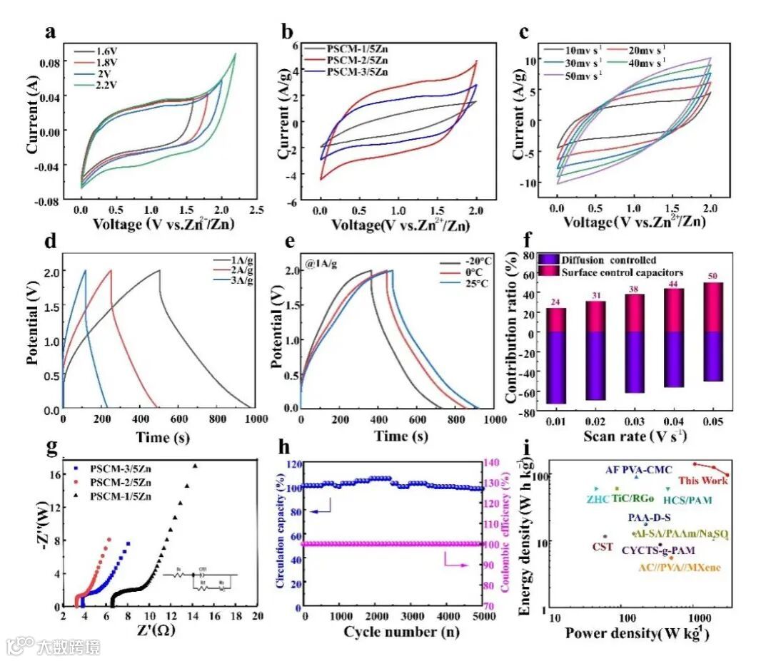 PSCM/Zn增强了可逆性,减少了锌金属电极的副反应和腐蚀,从而延长了循环寿命并拓宽了电化学窗口。所得柔性准固态ZIHCs具有良好的比容量(241 F g-1)、电池级能量密度(137 W h kg-1)、高功率密度(1.01 kW kg-1)以及优异的循环寿命(3000次充放电后容量保持100%)。
