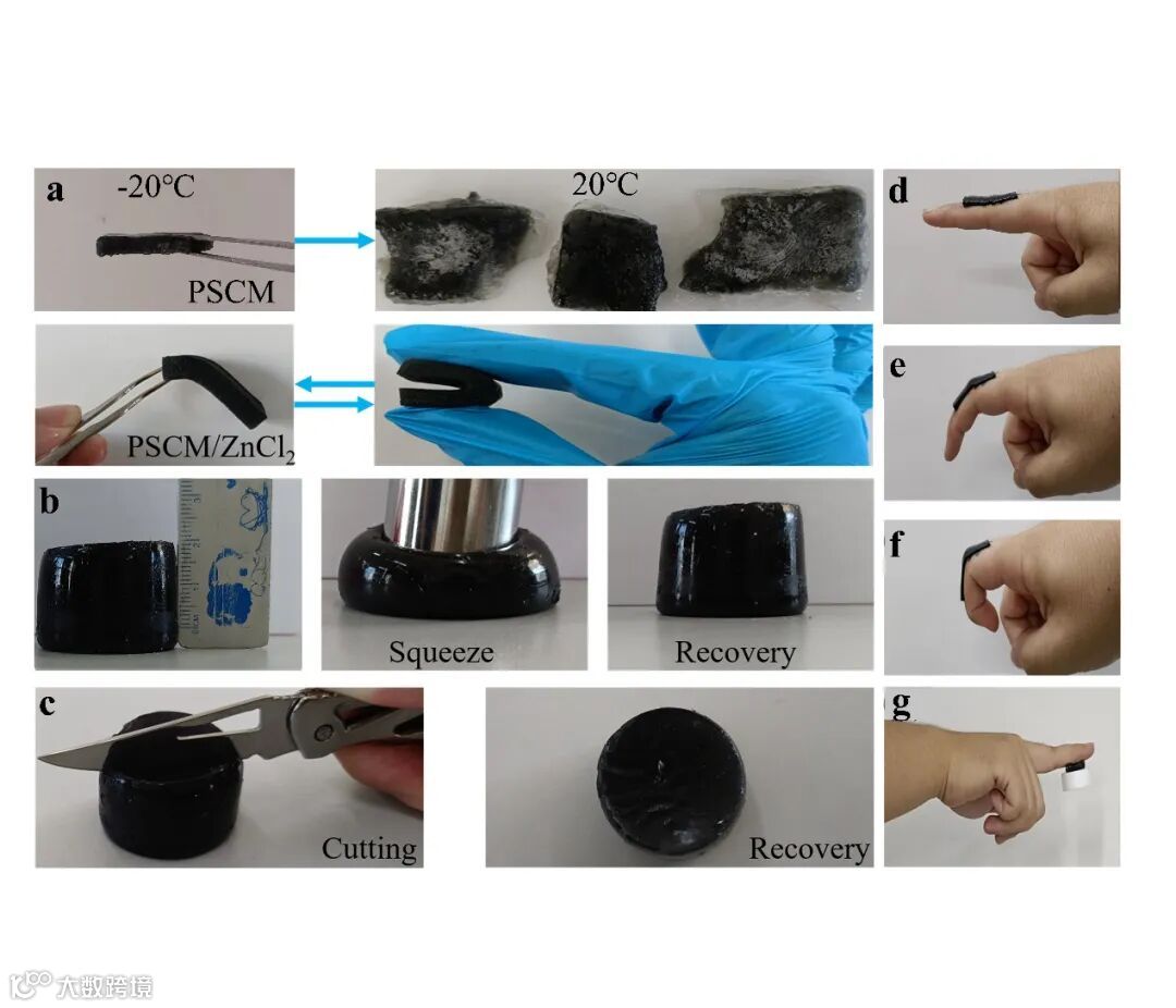 高度浓缩的ZnCl₂因良好的水溶性和比其他无机盐更好的保水能力,使得PSCM/Zn具有优异抗冻性;PSCM/Zn水凝胶在-20°C时仍透明且柔软,与PSCM水凝胶在此温度下变得不透明且易碎形成对比。且凝胶能承受深度压缩,并在外力撤除后完全恢复。其结构在强行切割时仍能保持完整,不留痕迹;同时PSCM/Zn水凝胶具有大量的氢键,表现出良好的变形性和粘附性,能适应各种形状并粘附在不同角度弯曲的手指上。与其他MXene基水凝胶相比,PSCM/Zn水凝胶在便利性和实用性方面具有明显优势。