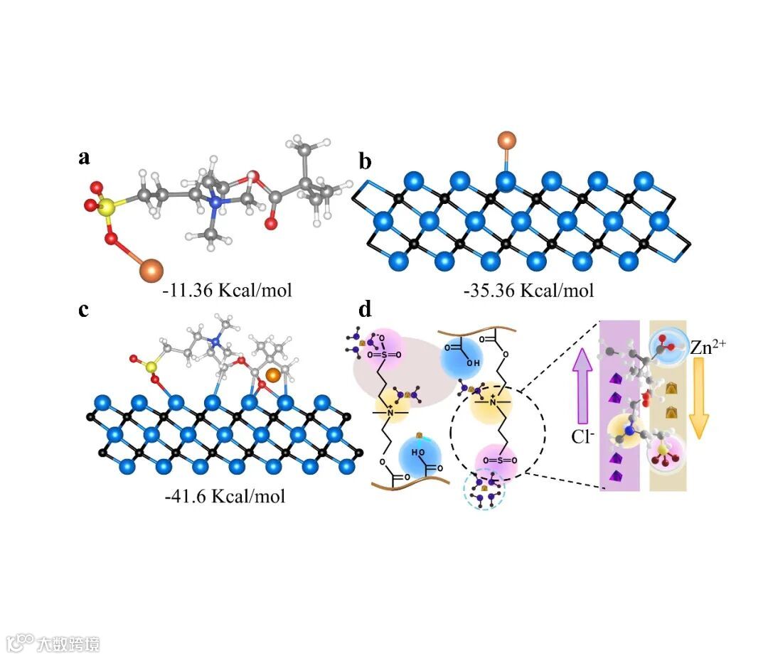 MXene的介入可能在水凝胶单体SBMA上形成了一个更大的离子传输系统。DFT计算显示,MXene显著增强了SBMA/MXene片段对锌离子的结合能力,表明PSCM/Zn电解质对锌离子具有强吸引力,且整体电子和离子迁移能力显著提高。