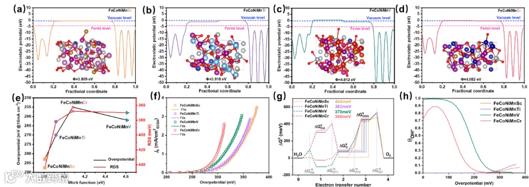 通过使用实时动力学模拟拟合动力学电流密度,进一步研究了FeCoNiMn-x催化剂上结构-性能的关系。其中FeCoNiMnCr上形成OOH*反应中间体的活化能(368 meV)低于FeCoNiMnSc(444 meV),FeCoNiMnTi(382 meV)和FeCoNiMnV(370 meV)上的活化能,这表明FeCoNiMnCr具有较好的OER性能,这也与之前的实验结果一致。综上,由计算和实验共同验证了FeCoNiMnCr具有更好的催化活性,确定了其在OER的增强性能。