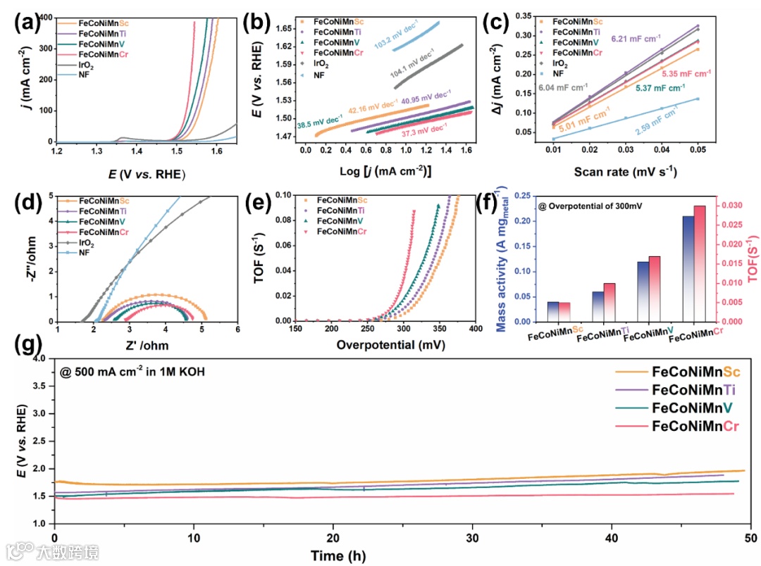 FeCoNiMnCr催化剂在10mA cm–2的电流密度下表现出255 mV的超低过电位。FeCoNiMnCr催化剂的Tafel为斜率37.3 mV dec–1。Nyquist图显示,FeCoNiMnCr在1 M KOH过电位为300 mV时,电荷转移电阻(Rct)最低,约为1.78 Ω、。这表明在电化学OER过程中,FeCoNiMnCr表面具有最高的电子导电性和更快的电荷转移。因此,Cr所诱导原位重构形成的HEA-HEO结构进一步提高了电活性,为高效OER提供了更多的活性位点。将四种多金属高熵催化剂进行了电流密度为500 mA cm−2的48小时的稳定性测试。其中Cr诱导形成的HEA-HEO多金属高熵催化剂具有长时间稳定性潜能。
