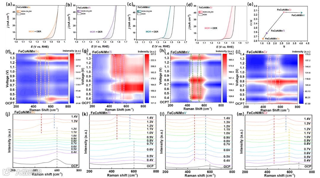 图 4. FeCoNiMn-x催化剂MOR及Operando Raman。