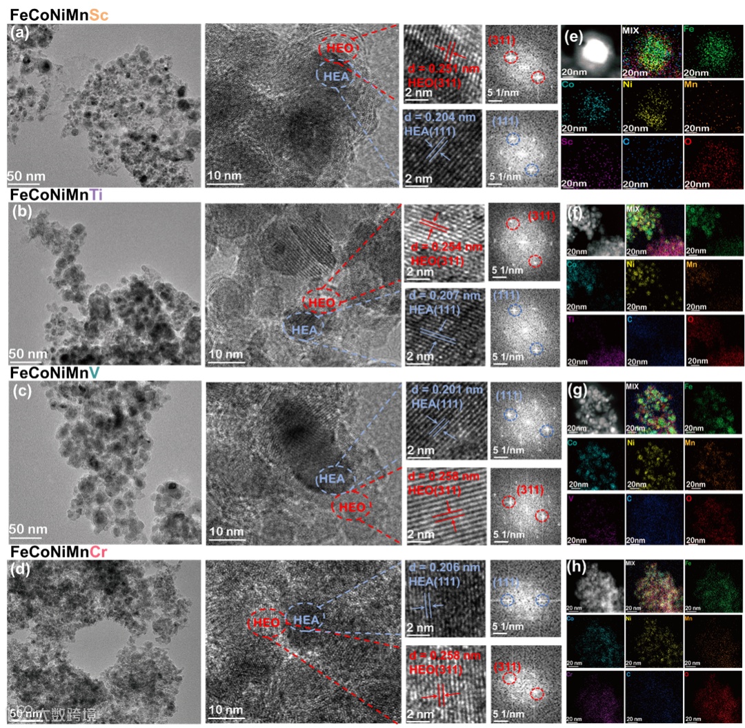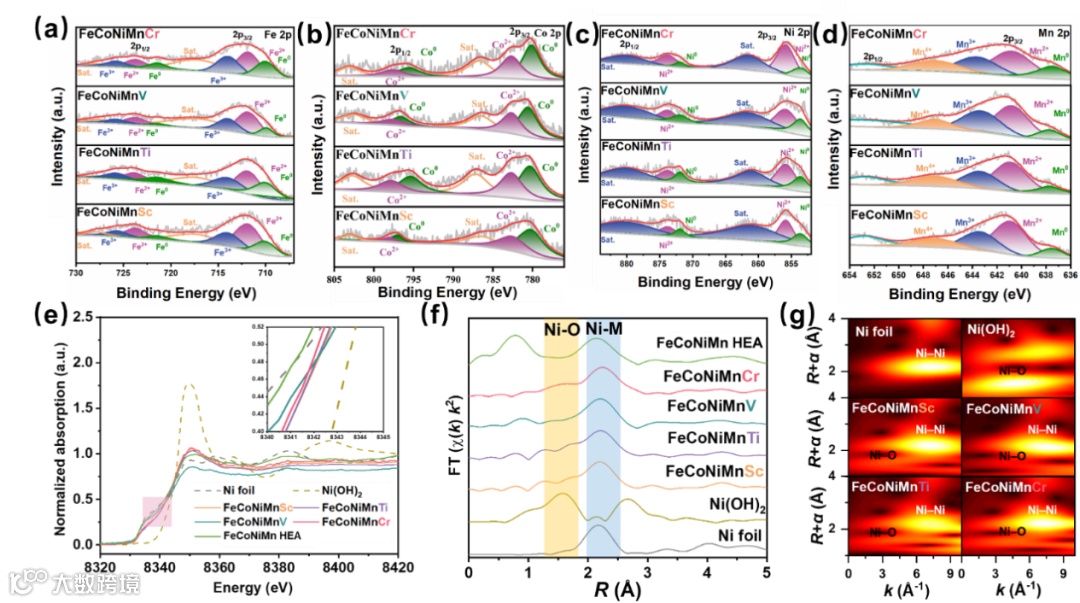 用X射线光电子能谱(XPS)进一步揭示了FeCoNiMn-x催化剂通过过渡金属Cr,V,Ti,Sc自身诱导产生HEO的电子结构调制和元素价态。O(at%):ICP-OES中的第五种金属x(at%)的结果为:2.75(FeCoNiMnSc), 2.62(FeCoNiMnTi), 2.16(FeCoNiMnV), 2.14(FeCoNiMnCr),呈现下降趋势。四种金属的亲氧性趋势也如预期呈现Sc>Ti>V>Cr。同步辐射结果进一步证实了Ni─O和Ni─M壳层在FeCoNiMn-x中共存,表明了HEA-HEO结构的成功合成。