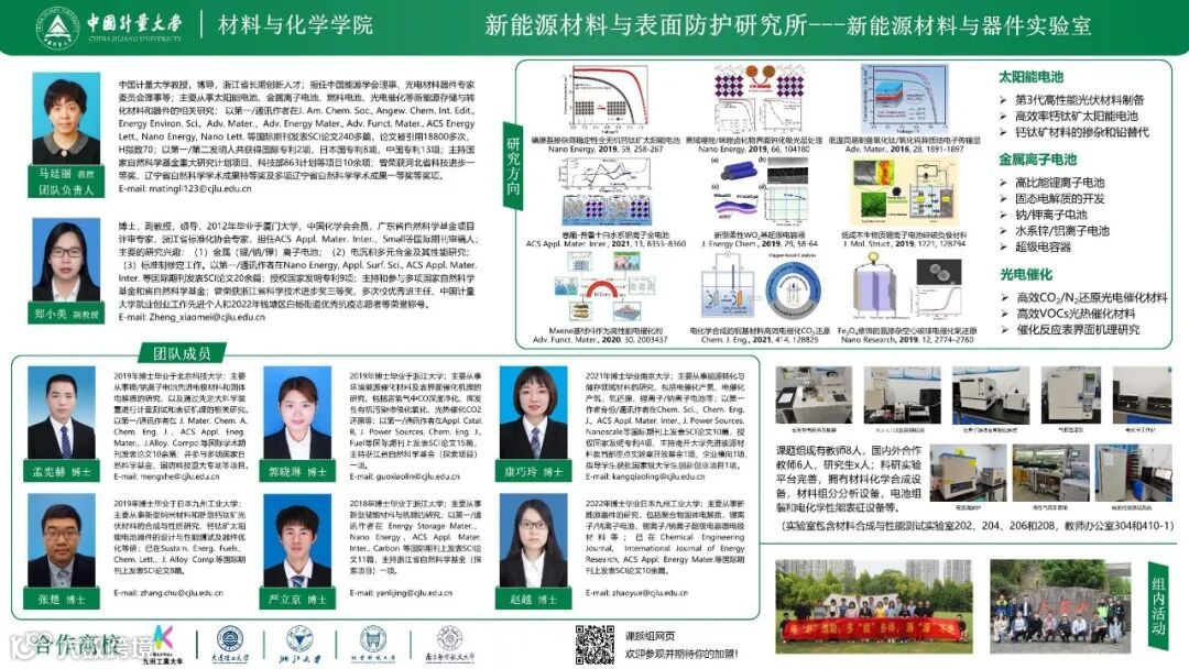 中国计量大学新能源与环境材料研究所---新能源材料与器件课题组,课题组现有教师7人,国内外合作教师6人,研究生20人;科研实验平台完善,拥有材料化学合成设备,材料组分分析设备,电池组装和电化学性能表征设备等。