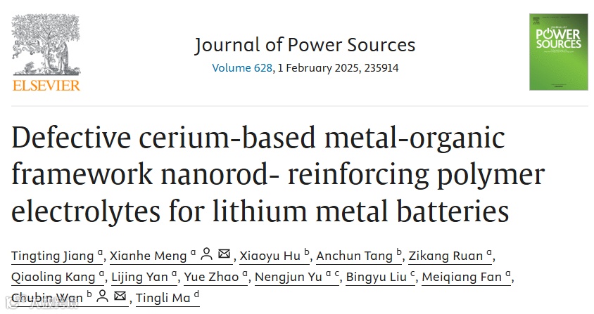 中国计量大学孟宪赫、北京科技大学万初斌和九州工业大学马廷丽团队,在国际知名期刊Journal of Power Sources上发表题为“Defective cerium-based metal-organic framework nanorod-reinforcing polymer electrolytes for lithium metal batteries”的研究文章。该文章分析了缺陷型MOFs在聚合物固态电解质之间的电化学性能,同时研究了Li+在缺陷型MOFs与电解质之间的离子传输机制。