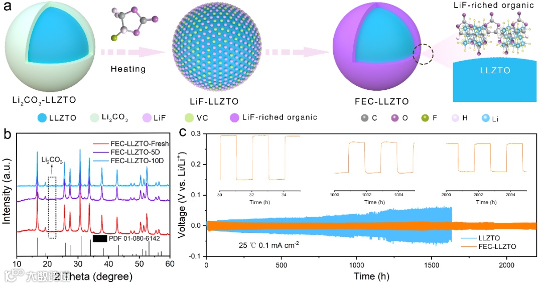 图1. a)FEC和LLZTO 的反应机理图,b)FEC-LLZTO的防水性;c)Li+在FEC-LLZTO/Li界面稳定性。