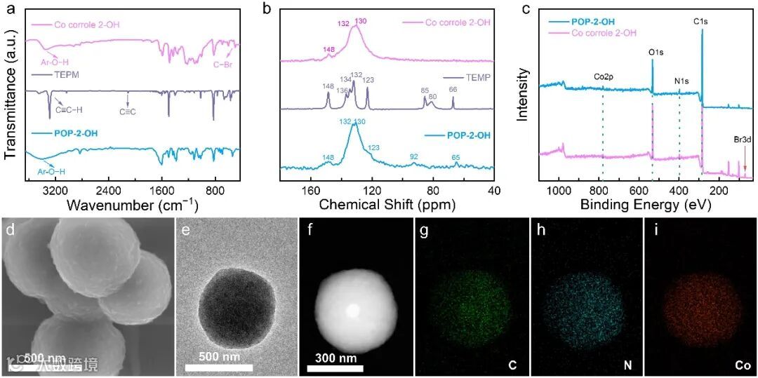 图3. (a) Co corrole 2-OH,TEPM和POP-2-OH的红外光谱和(b)固体核磁共振谱,(c) Co corrole 2-OH和POP-2-OH的X射线光电子能谱,(d) POP-2-OH的扫描电镜和(e)透射电镜图像,(f)高角环形暗场图像和(g-i)对应的元素映射图像