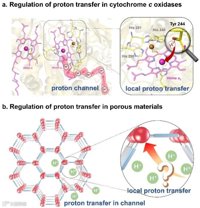 图1. CcOs (a)和多孔材料(b)中的质子转移