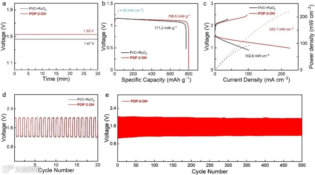 图6. 用POP-2-OH和Pt/Ru材料组装的电池的(a)开路图(b)比容量(c)充放电极化和相应的峰值功率密度和(d)在2 mA/cm2下的充放电循环数据。e) POP-2-OH在2 mA/cm2下的电池的500圈循环测试