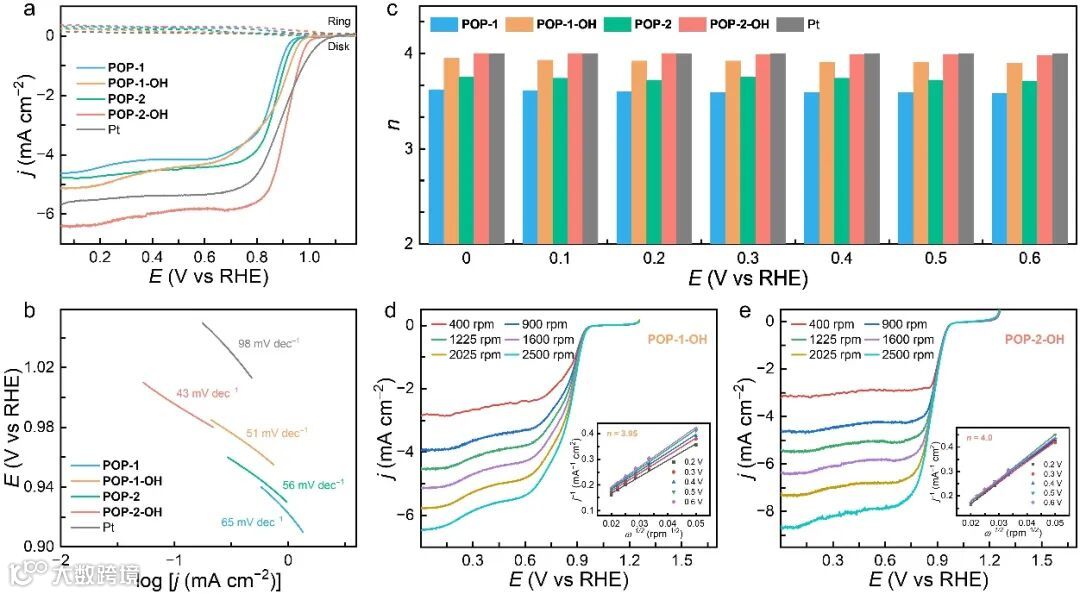 图4. (a)在O2饱和的0.1 M KOH溶液中,1600 rpm转速下POP-1、POP-2、POP-1-OH和POP-2-OH的RRDE数据。(b)通过RRDE获得在0.1 M KOH溶液中POP-1、POP-2、POP-1-OH和POP-2-OH的ORR的转移电子数(n)值。(c) POP-1、POP-2、POP-1-OH和POP-2-OH的Tafel斜率。(d-e)在0.1 M KOH溶液中不同转速下的POP-1-OH和POP-2-OH的RDE数据。条件: GC圆盘电极(面积0.125 cm2),Pt环电极(面积0.188 cm2),扫描速率5 mV s‒1(插入图: K-L图)