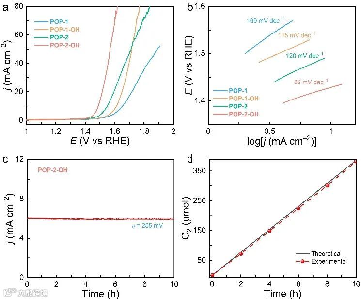 图5. (a) OER lsv和(b) 0.1 M KOH溶液中POP-1、POP-1-OH、POP-2和POP-2-OH的OER Tafel斜率。(c)在ŋ = 255 mV下用POP-2-OH进行OER电解。(d) POP-2-OH电解过程中产生的O2的观察和理论量