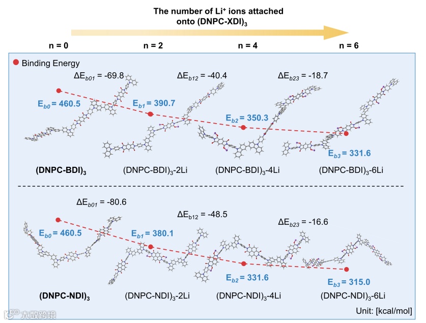 图5. (DNPC-XDI)₃(X = N, B)锂化产物的低能结构及其与Li⁺离子的结合能