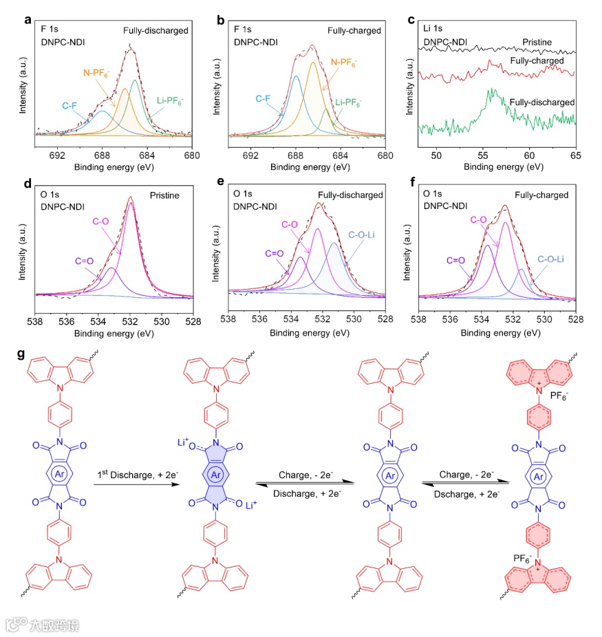 图4. (a,b)Poly(DNPC-NDI)电极在(a)完全放电态和(b)完全充电态时F 1s区域的XPS谱图。c()Poly(DNPC-NDI)电极在不同状态下Li 1s区域的XPS谱图。(d-f)Poly(DNPC-NDI)电极在(d)原始态、(e)完全放电态和(f)完全充电态时O 1s区域的XPS谱图。(g)Poly(DNPC-XDI)(X=N,B)电极阳离子和阴离子共存储机制的示意图。