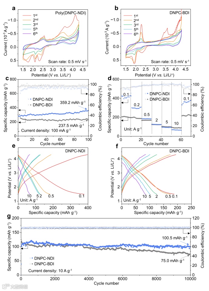 图2. (a, b) 分别在1.5-4.3 V vs. Li/Li+电压范围内、扫描速率为0.5 mV s-1条件下测得的(a)DNPC-NDI向Poly(DNPC-NDI)和(b)DNPC-BDI向Poly(DNPC-BDI)转化的循环伏安曲线。(c) 在100 mA g-1电流密度下测试的Poly(DNPC-NDI)和Poly(DNPC-BDI)电极的循环性能与库仑效率。(d)Poly(DNPC-NDI)和Poly(DNPC-BDI)电极在0.1-10 A g-1电流密度范围内的倍率性能。(e, f)分别为(e)Poly(DNPC-NDI)和(f)Poly(DNPC-BDI)电极在不同电流密度下的恒电流充放电曲线。(g)Poly(DNPC-NDI)和Poly(DNPC-BDI)电极在10 A g-1电流密度下的长循环性能。