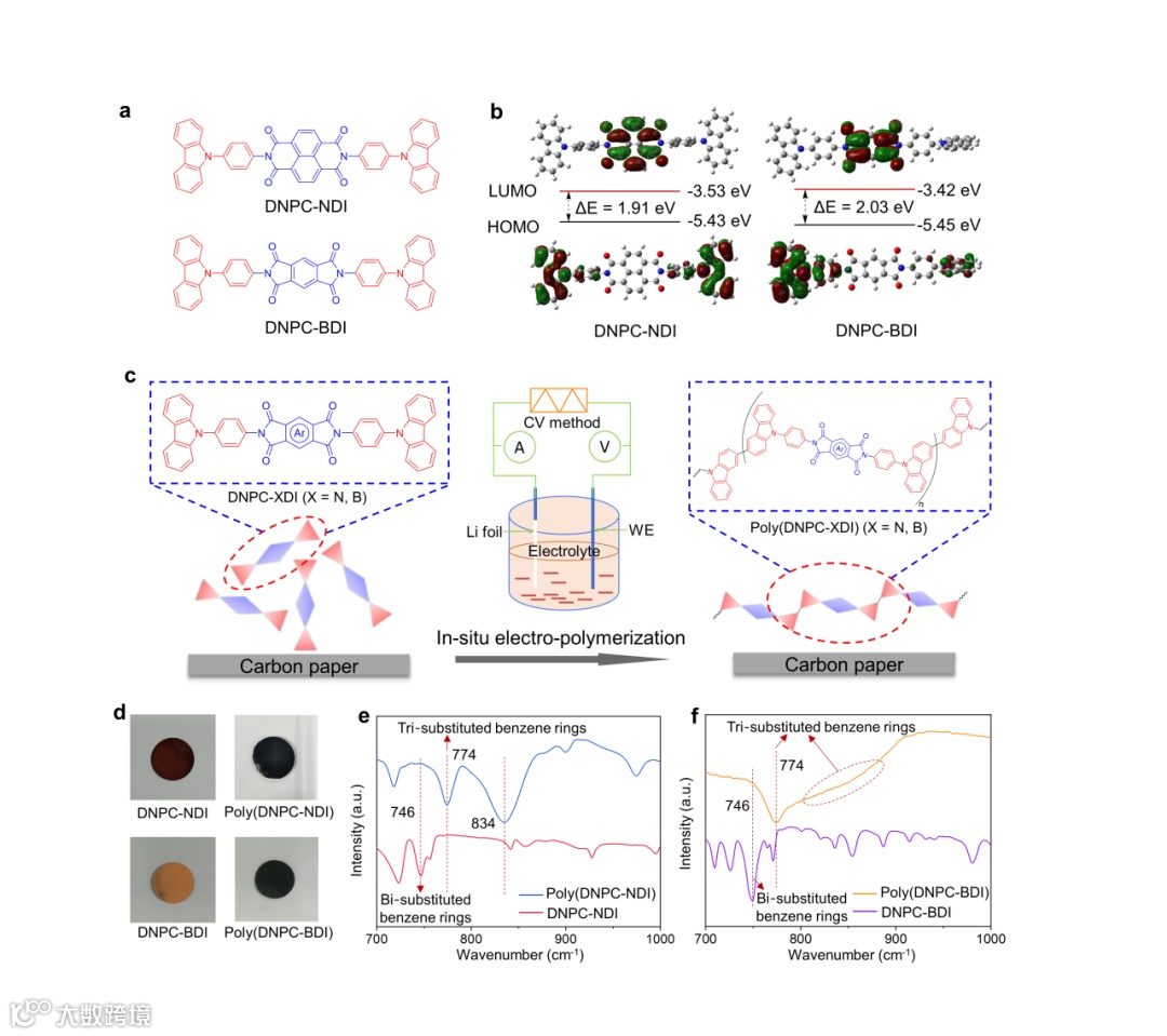 图1. (a) DNPC-NDI与DNPC-BDI的分子结构示意图。(b) DNPC-NDI和DNPC-BDI的DFT计算最高占据分子轨道(HOMO)和最低未占分子轨道(LUMO)能级,并列出了HOMO-LUMO能隙值。(c) DNPC-XDI(X = N, B)原位电聚合过程示意图。(d) DNPC-NDI和DNPC-BDI电极在电聚合前后的照片对比。(e, f)分别为(e) DNPC-NDI和(f) DNPC-BDI电极在电聚合前后的ATR-FTIR光谱图。