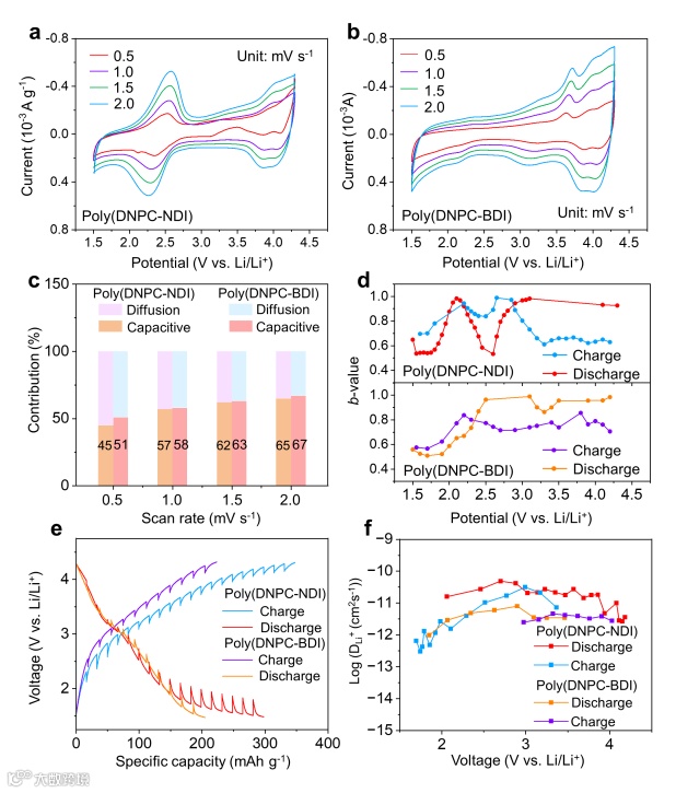 图3. (a)Poly(DNPC-NDI)和(b)Poly(DNPC-BDI)电极在不同扫描速率下的循环伏安曲线。(c) Poly(DNPC-NDI)和Poly(DNPC-BDI)电极在不同扫描速率下电容贡献与扩散控制容量的归一化占比。(d)Poly(DNPC-NDI)和Poly(DNPC-BDI)电极在放电和充电过程中b值随电位变化的计算结果。(e)Poly(DNPC-NDI)和Poly(DNPC-BDI)电极在200 mA g-1恒定电流密度下进行GITT测试时的电位响应曲线,以及(f)根据GITT结果计算得到的相应离子扩散系数。