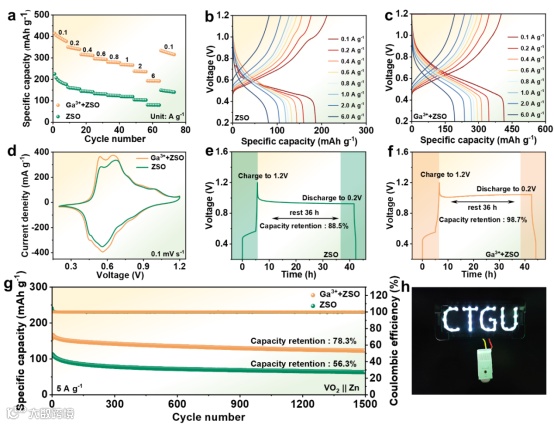 图6:采用Ga3++ZSO和ZSO电解液的Zn||VO2全电池的电化学特性。a) Ga3++ZSO和ZSO电解液组装的Zn||VO2全电池的倍率容量;b) 使用ZSO电解液的Zn||VO2全电池的恒流充放电曲线;c) 使用Ga3++ZSO电解液的Zn||VO2全电池的恒流充放电曲线;d) Zn||VO2全电池的CV曲线;e) 使用ZSO电解液配置的Zn||VO2电池的自放电曲线;f) 使用Ga3++ZSO电解液配置的Zn||VO2电池的自放电曲线;g) 在5 A g−1下Zn||VO2全电池的循环耐久性;h) 使用Ga3++ZSO电解液组装的Zn||VO2全电池点亮带有“CTGU”字样的LED灯。