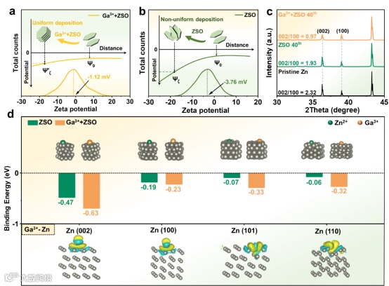 图2:a) Ga3++ZSO和ZSO电解液中锌沉积的zeta电位和电化学双层特性比较;b) Ga3++ZSO和ZSO电解液中锌沉积的zeta电位和电化学双层特性比较;c) ZSO和Ga3++ZSO电解液中循环锌的XRD分析;d) Zn2+和Ga3+在锌(002)、(100)、(101)和(110)晶面上的结合能(上);Ga3+在锌(002)、(100)、(101)和(110)表面的差分电荷密度(下)。