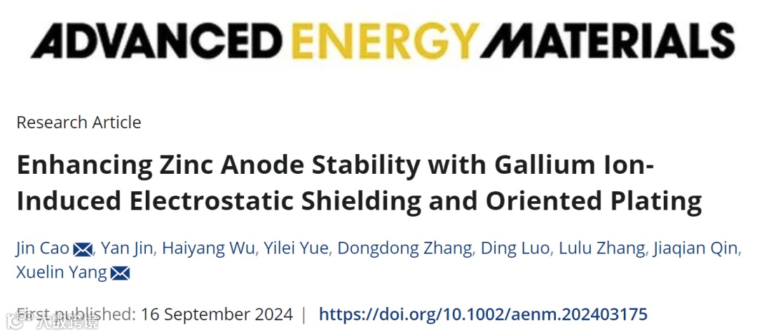 Jin Cao, Yan Jin, Haiyang Wu, Yilei Yue, Dongdong Zhang, Ding Luo, Lulu Zhang, Jiaqian Qin, and Xuelin Yang, "Enhancing Zinc Anode Stability with Gallium Ion-Induced Electrostatic Shielding and Oriented Plating," Advanced Energy Materials, 2024, 2403175. DOI: 10.1002/aenm.202403175.