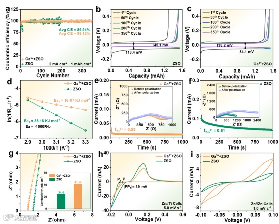 图5:a) 在2 mA cm−2(1 mAh cm−2)电流密度下Zn||Ti半电池的库仑效率(CE);b,c) Zn||Ti半电池的电压-容量曲线;d) Ga3++ZSO和ZSO电解液的活化能;e,f) 在Ga3++ZSO和ZSO电解液中Zn2+迁移数的评估;g) Ga3++ZSO和ZSO电解液的离子电导率比较;h) Zn||Ti半电池在5.0 mV s−1的CV曲线;i) Zn||Zn对称电池的CV曲线。