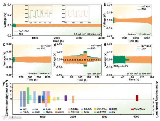 图3:对称电池在有无Ga3+添加时的电化学性能评估。a) 在1.2 mA cm−2、0.6 mAh cm−2条件下锌对称电池的循环特性;b) 在5 mA cm−2和2.5 mAh cm−2条件下锌对称电池的循环稳定性;c) 在10 mA cm−2和5 mAh cm−2条件下锌对称电池的循环稳定性;d) Ga3++ZSO和ZSO电解液中对称电池的倍率性能;e) 在20 mA cm−2和20 mAh cm−2电流密度(放电深度约74.4%)下Zn||Zn(50 μm)电池的循环性能;f) Ga3++ZSO电解液与最近文献报道的ZIB改性相比,Zn||Zn对称电池的循环性能比较。