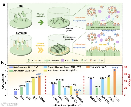 图1:a) Ga3+离子添加剂对Zn沉积过程影响的示意图;b) Ga3+改性电解液与其他金属离子添加剂在对称电池中的循环寿命、放电深度(DODZn)和市场价格的比较分析。