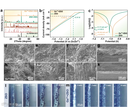 图4:Ga3++ZSO和ZSO电解液中锌沉积形态演变。a) 在Ga3++ZSO和ZSO电解液中循环后的锌阳极的XRD分析;b) Ga3++ZSO和ZSO电解液的线性扫描伏安(LSV)曲线;c) Ga3++ZSO和ZSO电解液的Tafel曲线;d-f) 在ZSO电解液中循环后的锌电极的平面SEM图像;g-j) 在Ga3++ZSO电解液中循环后的锌电极的平面SEM图像;k) 在ZSO电解液中循环后的锌电极的横截面SEM图像;l) 在Ga3++ZSO电解液中循环后的锌电极的横截面SEM图像;m) ZSO电解液中锌沉积的原位观察;n) Ga3++ZSO电解液中锌沉积的原位观察。