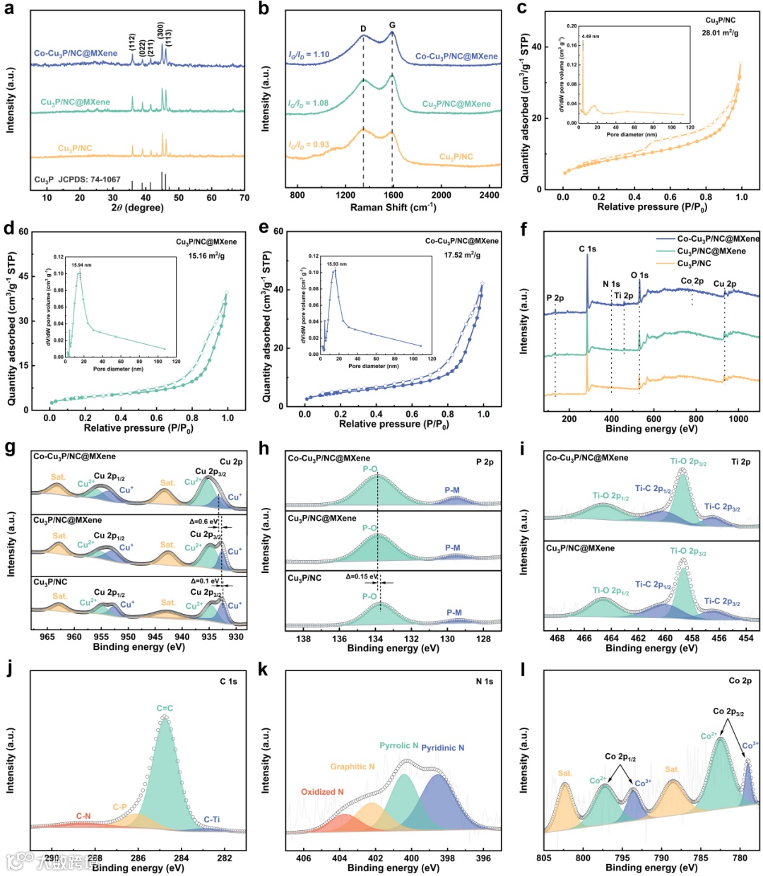 图 2.(a)XRD图谱和(b)拉曼光谱。(c)Cu3P/NC、(d)Cu3P/NC@MXene和(e)Co-Cu3P/NC@MXene的N2吸附-解吸等温线(插图为相对孔径分布曲线)。(f)Cu3P/NC、Cu3P/NC@MXene和Co-Cu3P/NC@MXene的XPS能谱图。(g)Cu 2p和(h)P 2p的高分辨率XPS能谱图。(i)Ti 2p的高分辨率XPS能谱图。Co-Cu3P/NC@MXene的(j)C 1s、(k)N 1s和(l)Co 2p的高分辨率XPS能谱图。