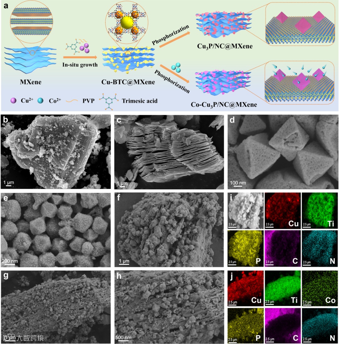 图1.(a)Cu3P/NC@MXene和Co-Cu3P/NC@MXene合成路线示意图。(b)Ti3AlC2,(c)MXene,(d)Cu-BTC,(e)Cu3P/NC,(f)Cu3P/NC@MXene的SEM图。(g和h)Co-Cu3P/NC@MXene的SEM图。(i)Cu3P/NC@MXene和(j)Co-Cu3P/NC@MXene的EDS映射图。