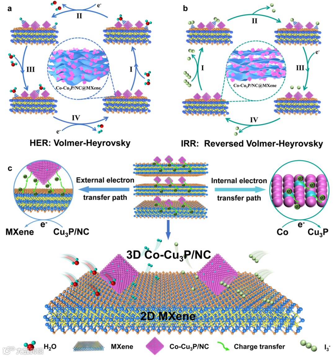 通过将MOF衍生物与MXene相偶联构建了3D@2D的分级结构,该结构不仅有效阻止了Co-Cu3P/NC纳米颗粒的聚集,还增强了电解液到催化剂界面的可及性,为电催化过程中的电荷和质量传递创造了最佳条件。在HER过程中,3D@2D结构提供了多个电子传递通道,实现了电子从催化剂表面到活性位点的有效转移,从而整体上增强了HER性能。在IRR过程中,Co-Cu3P/NC@MXene催化剂中3D@2D结构的形成提供了丰富的活性位点,对I2的吸附起着至关重要的作用(图5)。
